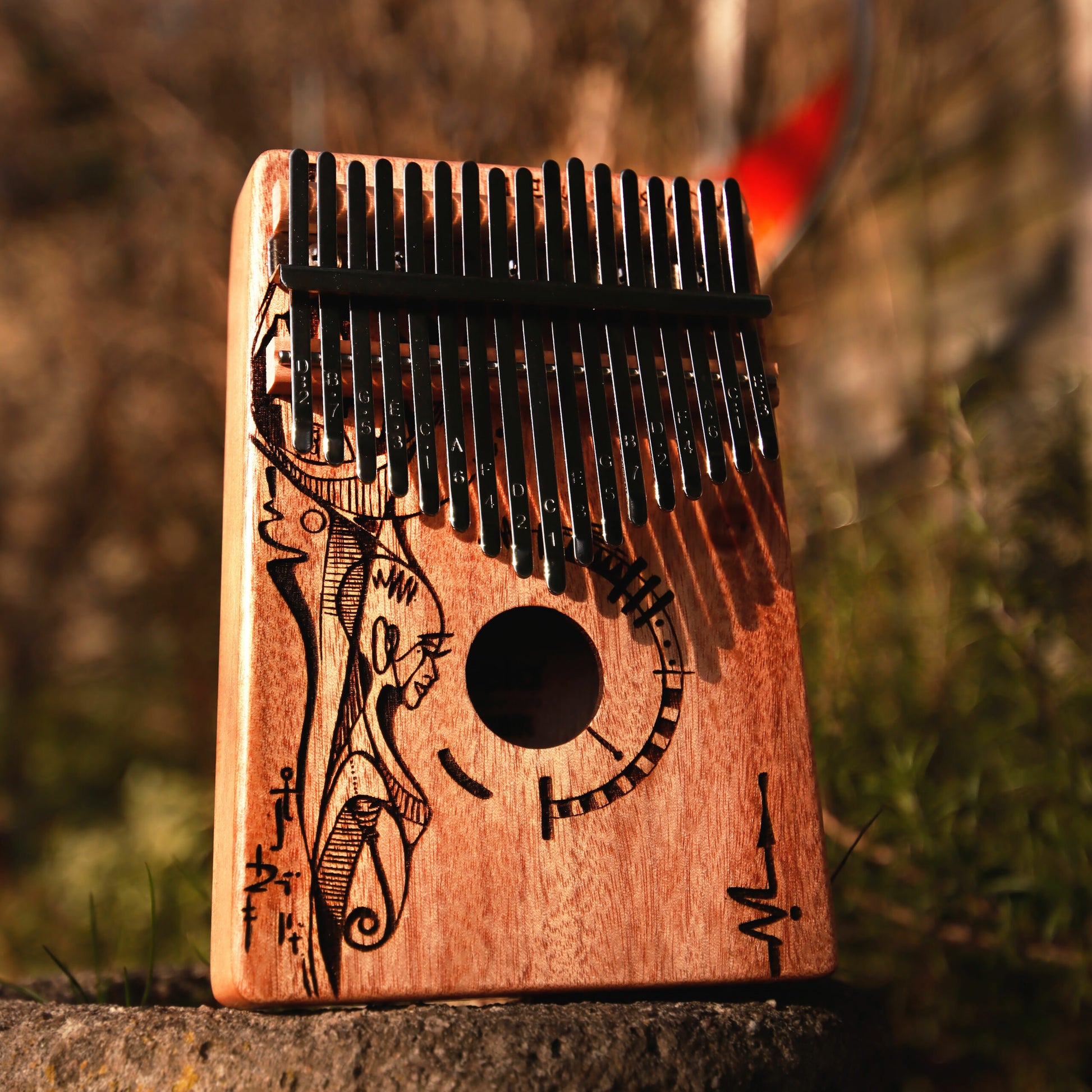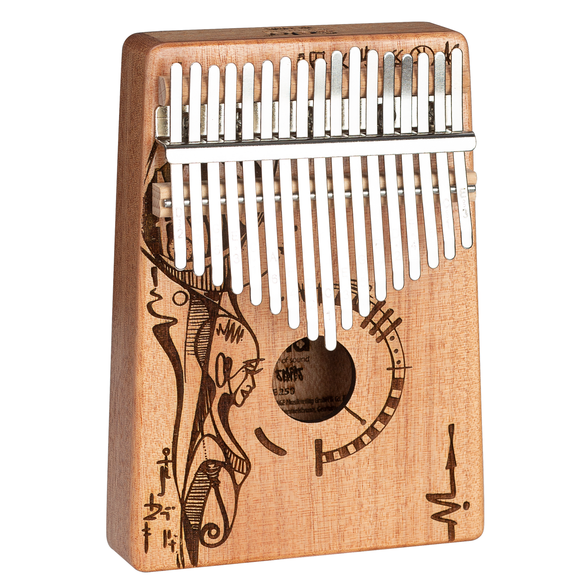 Die Art Series Kalimba 17 Peaceful Mind ist aus hochwertigem Mahagoni-Holz mit einem tollen und auffälligen Design gefertigt. Der Korpus verstärkt die tiefen Frequenzen und erzeugt dadurch einen vollen, klaren und warmen Klang mit einer faszinierenden Resonanz. Die hochwertigen Metall-Zungen sind in C-Dur gestimmt und haben einen Tonumfang von c' - e''' (C4 - E6). Durch die eingestanzten Noten auf den Klangzungen ist die Kalimba sowohl für Anfänger als auch für fortgeschrittene Spieler geeignet.