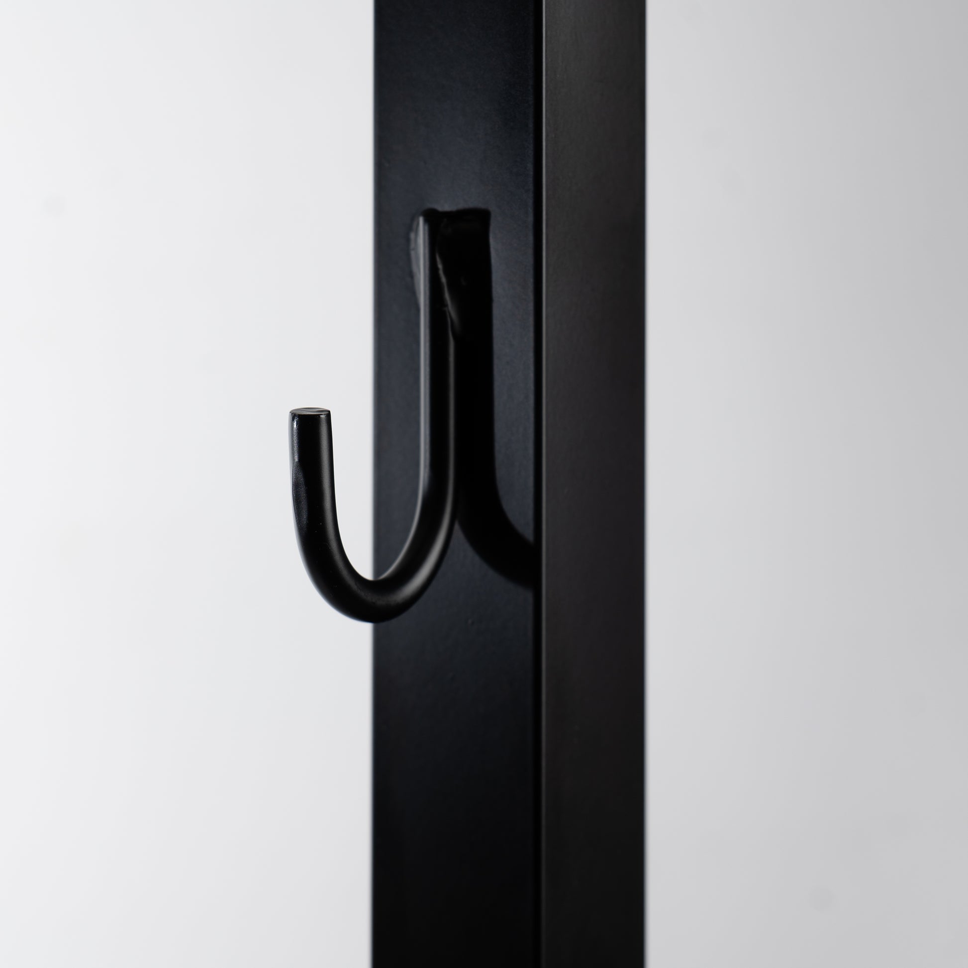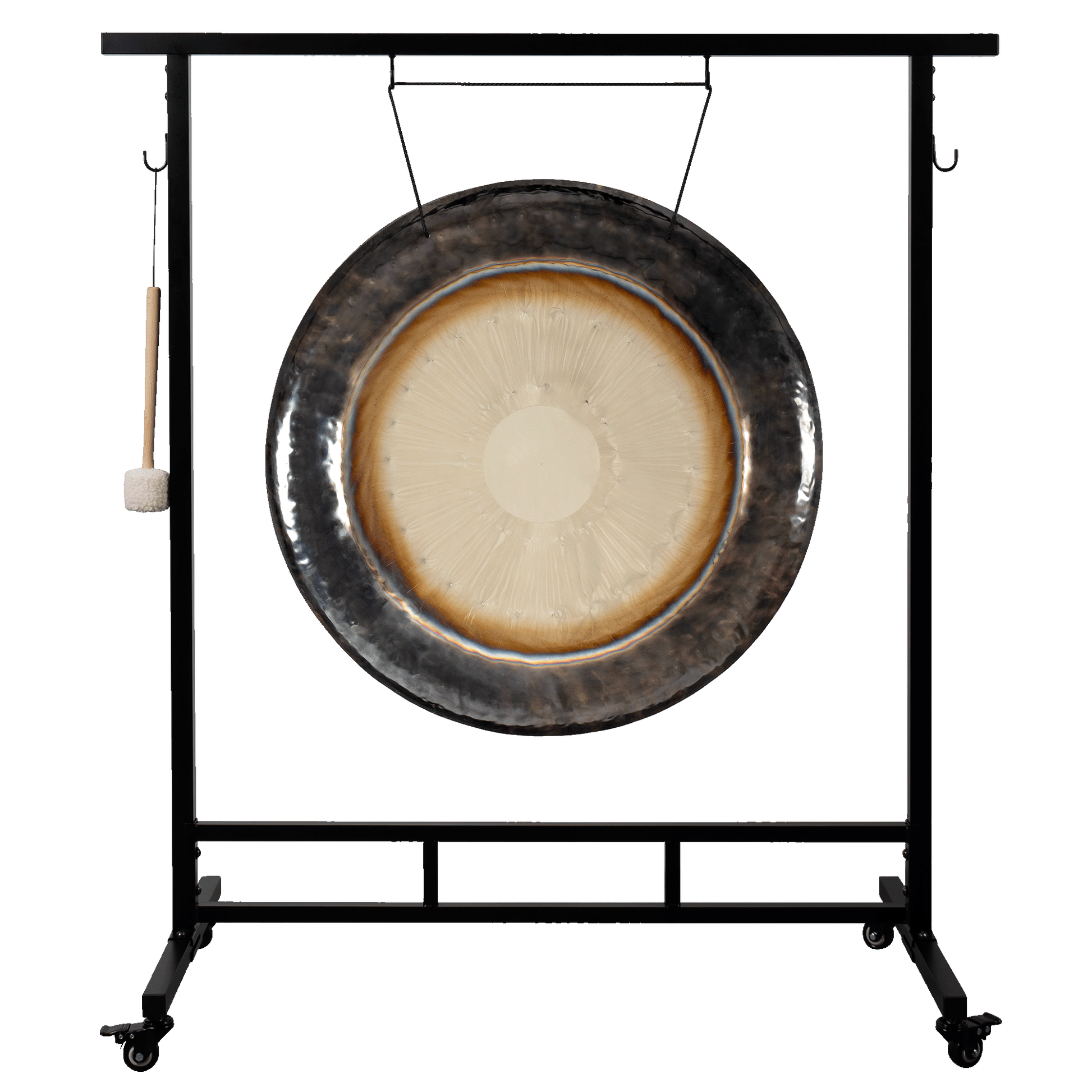 Stilvoll und modern setzt der rechteckige Rahmen den Gong in Szene und bietet ihm dabei stabilen Halt. Der Ständer aus schwarzem pulverbeschichtetem Stahl erlaubt dem Gong frei zu schwingen und sorgt so für ein umwerfendes Klangerlebnis. Die mehrfach verstärkte Stahlkonstruktion hält den Gong zuverlässig, auch in Schwingung. Die Feststellbremsen an zwei der vier Rollen an den Füßen fixieren den Ständer zudem am Platz. Die Haken an der rechten und linken Außenseite bieten die Möglichkeit, Equipment, wie zum Beispiel einen Schlägel, aufzuhängen.