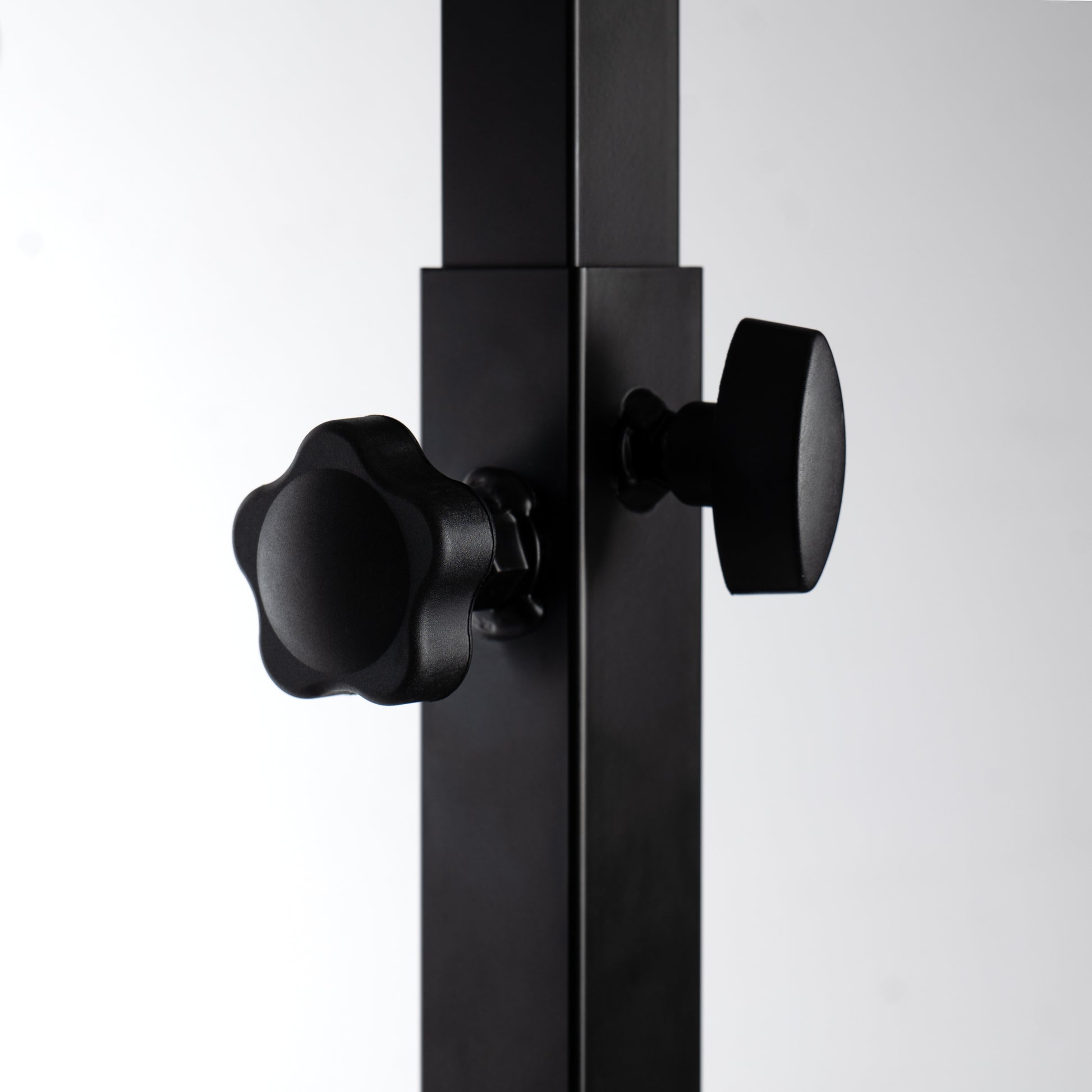 Mit seinem stilvollen und unauffälligen Design lenkt der Ständer nicht vom Gong ab und setzt ihn dabei gekonnt in Szene. Der Sela Gong Ständer Pro bietet unter den Sela Gongständern den stabilsten Halt. Der Ständer besteht aus schwarzem pulverbeschichtetem Stahl und ist dadurch nicht nur schick, sondern auch robust. Auch schwere Gongs werden zuverlässig von der mehrfach verstärkten Stahlkonstruktion gehalten. Die Feststellbremsen an jeder der vier Rollen an den Füßen fixieren den Ständer zudem an seinem Platz. Die Haken zum Einhängen des Gongs sind nochmal extra mit einer durchsichtigen Kunststoffhülle ummantelt. Das geschmackvolle Design wird von der silbernen Sela-Blume zwischen den Einhängehaken stimmig abgerundet.