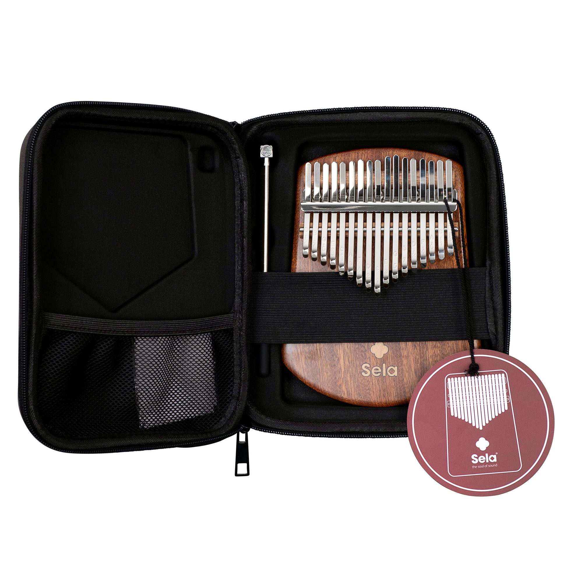 Zum Lieferumfang der Sela Kalimba 17 Sapelli gehört eine hochwertige Tasche mit Trageschlaufe und angepasster Polsterung, die das Instrument bei Lagerung und Transport effektiv vor Beschädigungen schützt. Außerdem liegen ein Mikrofasertuch für die Reinigung der Kalimba sowie ein Stimmhammer bei. Letzterer wird benötigt, wenn man das Instrument nachstimmen möchte. Dazu ein Tipp: Zur Kontrolle der Tonhöhe kann wahlweise ein Smartphone mit entsprechender Tuning-App oder auch ein kleiner Clip-on-Tuner für Gitarren verwendet werden.