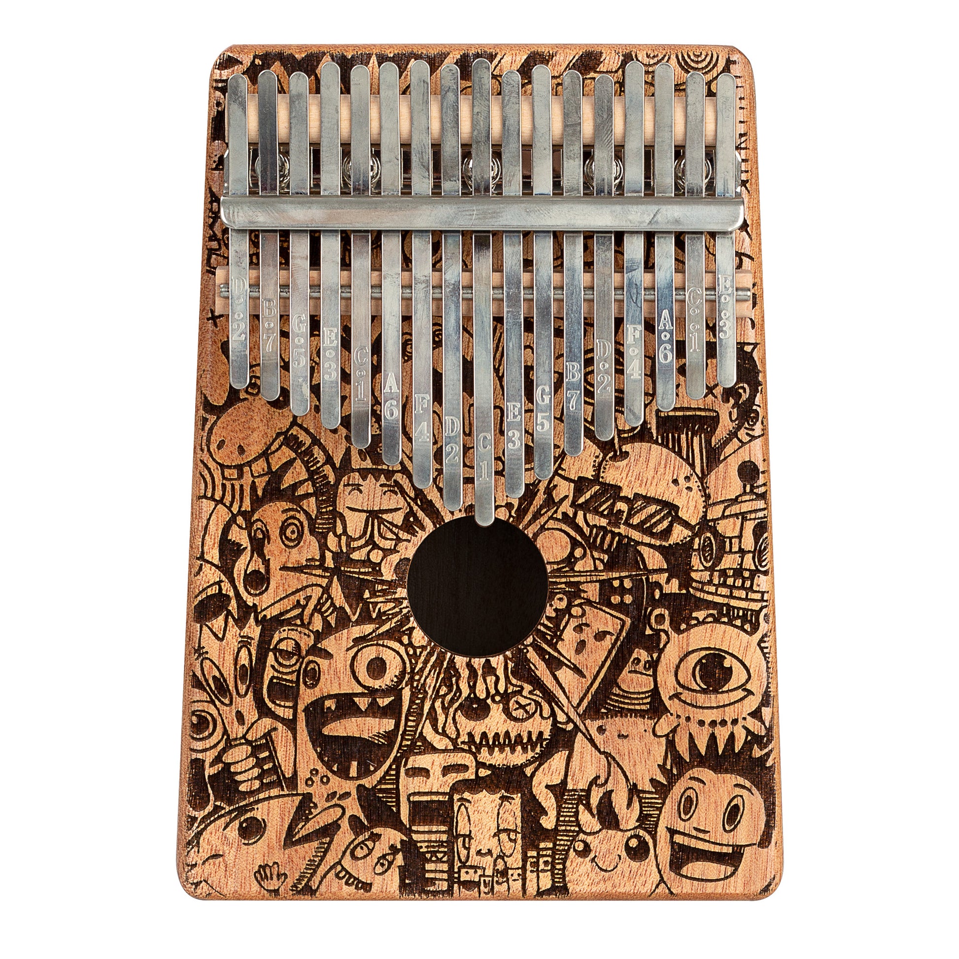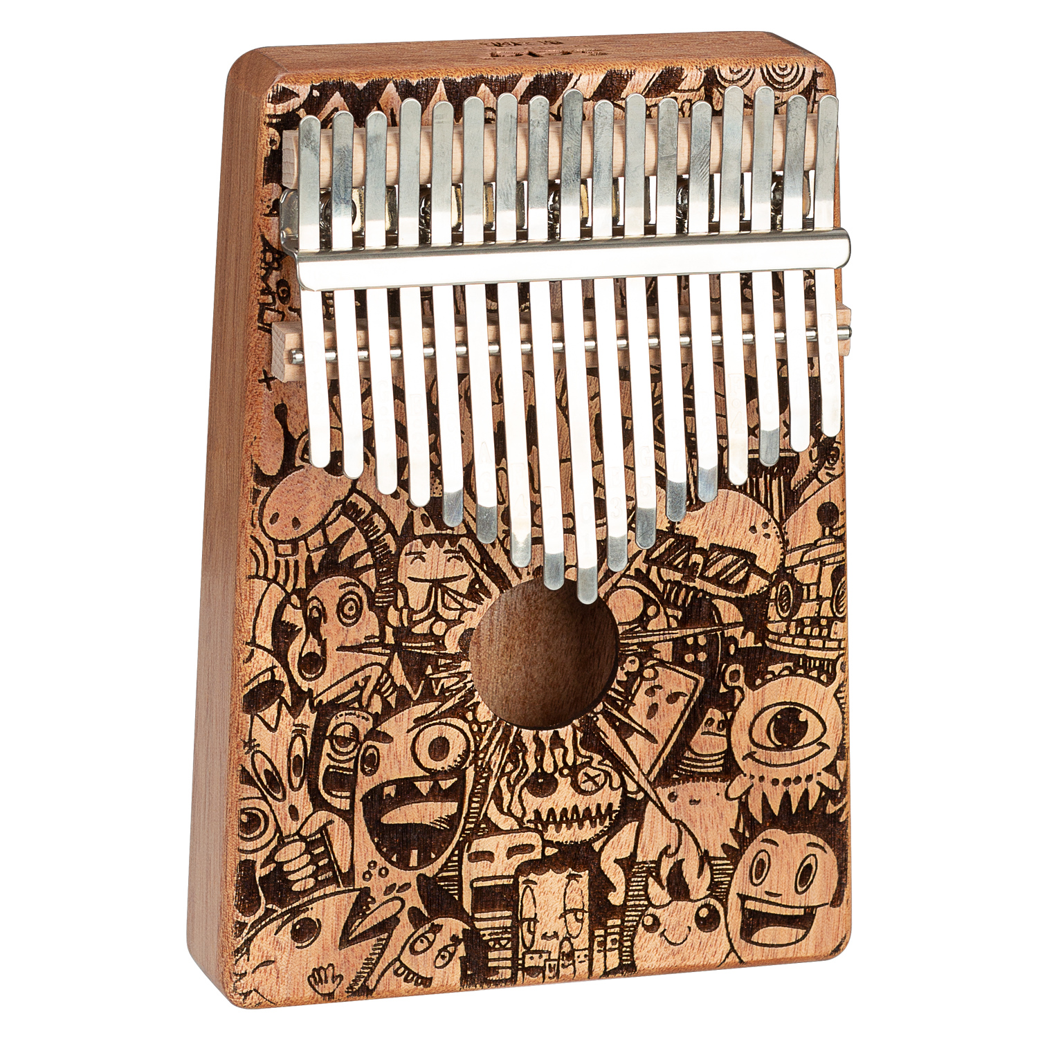 The Art Series Kalimba 17 Little Monster is made of high quality mahogany wood with a great and eye-catching design. The body amplifies the low frequencies, creating a full, clear and warm sound with a fascinating resonance. The high-quality metal reeds are tuned in C major and have a range of c' - e''' (C4 - E6). Due to the stamped notes on the reeds, the kalimba is suitable for beginners as well as for advanced players.