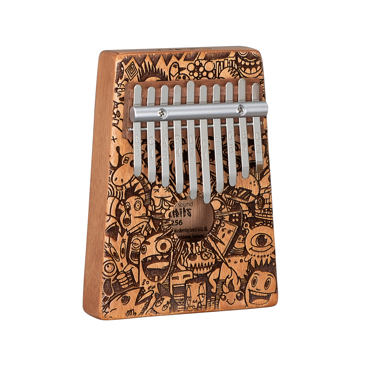 The Art Series Kalimba 10 Little Monster Laser is made of high quality mahogany wood with a great and eye-catching design. The body amplifies the low frequencies, creating a full, clear and warm sound with a fascinating resonance. The high-quality metal reeds are tuned in C major and have a range of c' - e'' (C4 - E5). Due to the stamped notes on the reeds, the kalimba is suitable for beginners as well as for advanced players.