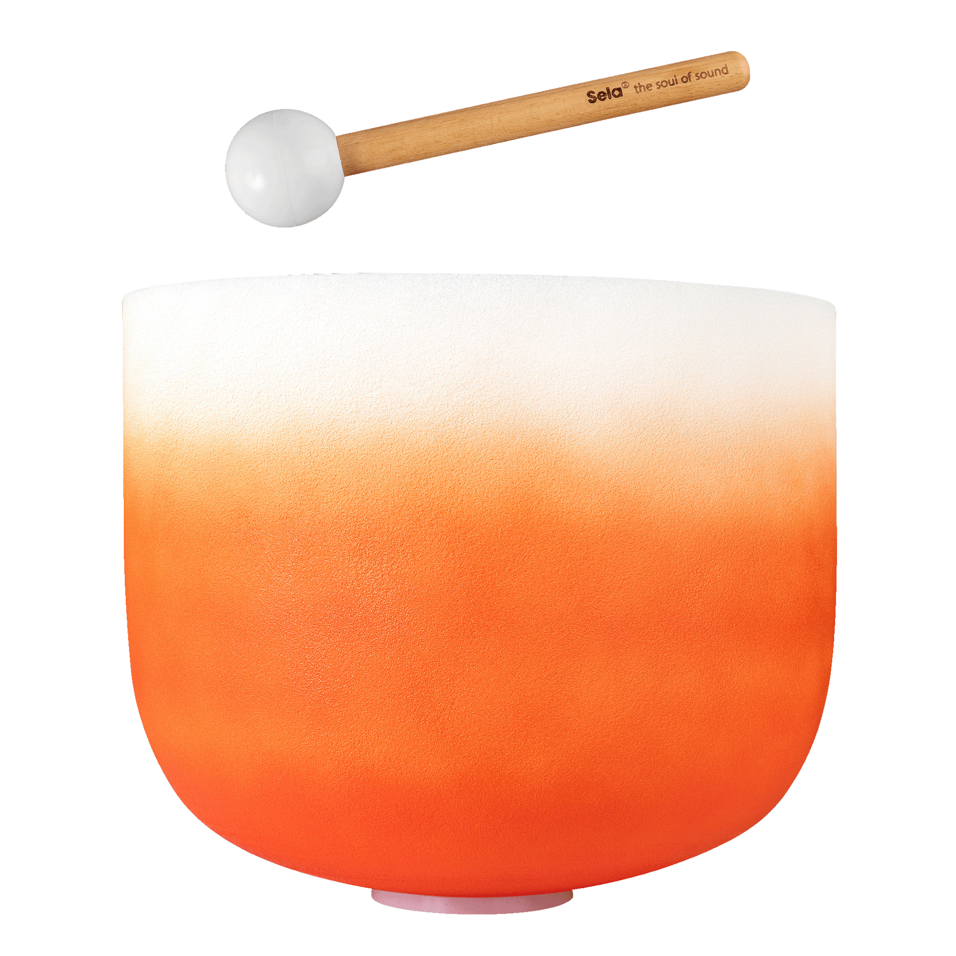 The orange coloured 13" model is aligned with the sacral chakra and tuned to the D note. In the 432 Hz version, however, the concert pitch A is not at the standard Western frequency of 440 Hz, but at 432 Hz. This tuning is said to have, among other things, a particularly relaxing and calming effect. However, this singing bowl does not harmonize with conventionally tuned instruments. It should be played either individually or together with other 432 Hz instruments - such as our Sela Unity Handpans.