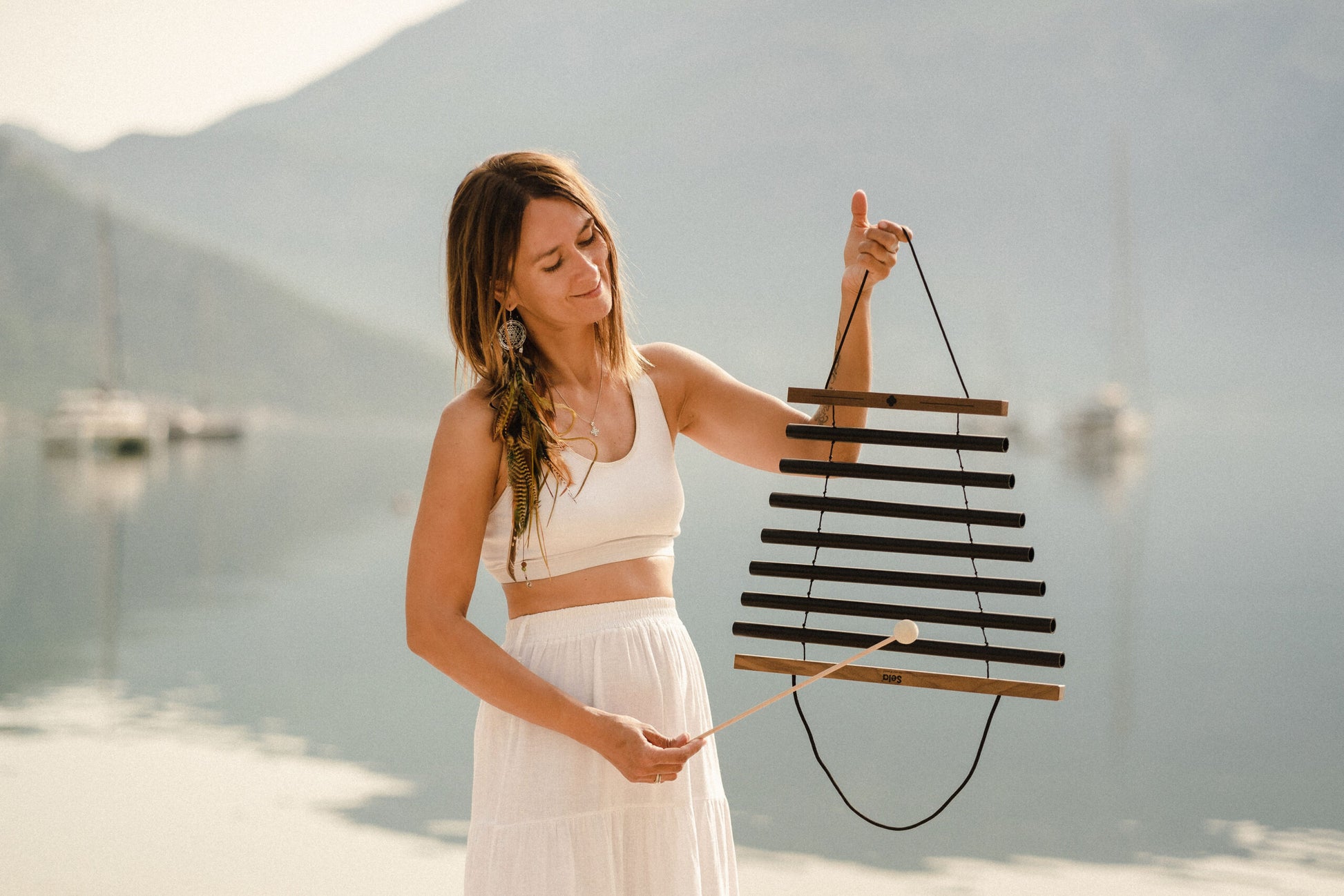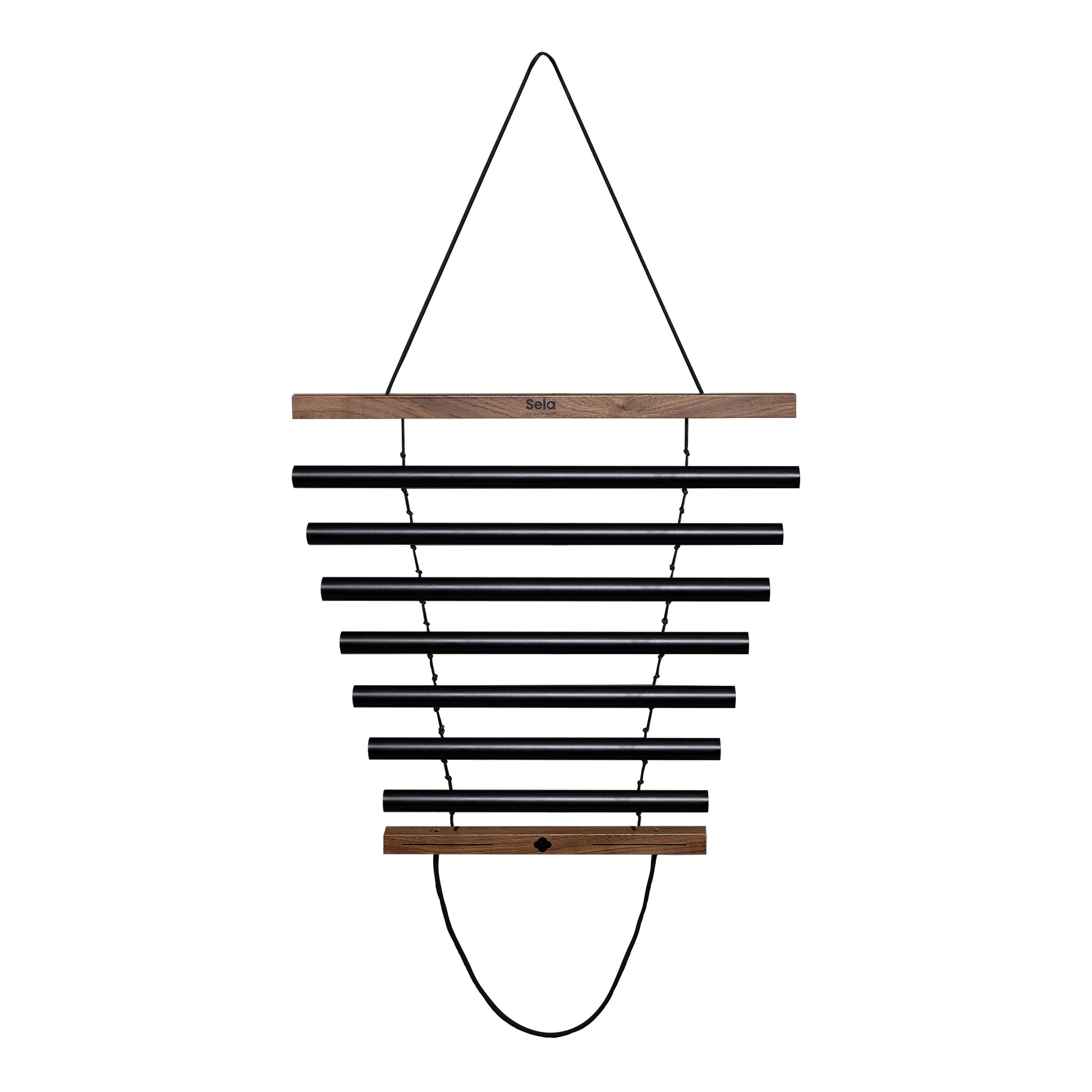 Sela Harmony Chimes produce an atmospheric, calming sound. The hand-held instrument consists of several aluminum sound tubes, which are secured by tear-resistant nylon cords and framed by two wooden holding rods. The Sela Harmony Chimes are played with the included mallet. Once set in motion, they can also be gently swung, turned or carefully swirled around to fill the whole room with their soft sound.