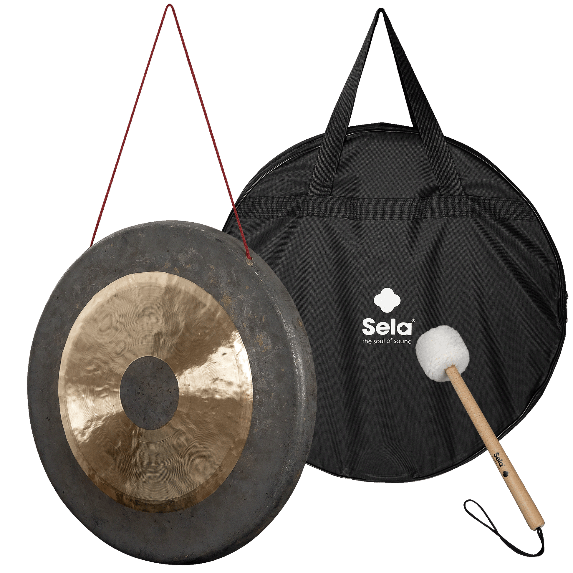 The Sela Chau gongs are real masterpieces, handmade in China from a special bronze alloy. They are available in sizes of 20, 24, 28, 32 and 36 inches. The larger the model, the deeper and also more voluminous the sound when struck. Included with each model is a maple mallet with a plastic head with velvet cover and a zippered carrying case.