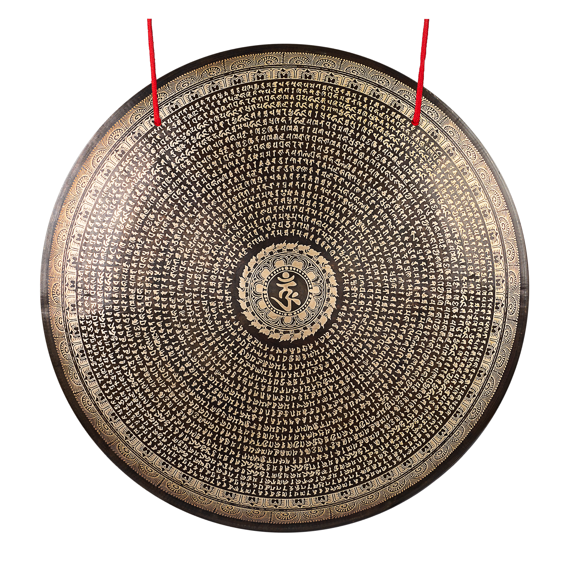 The Mantra design features a predominantly dark, low-gloss surface contrasted with densely engraved concentric rows of the Tibetan Buddhist mantra Om Mani Padme Hum in traditional Tibetan script. The engravings expose brighter bronze tones, creating subtle reflective highlights and a finely structured surface. The central Om symbol forms the visual focal point of the design. Variations in surface treatment and engraving depth subtly influence the response and overtone articulation while maintaining a warm, sustained tonal character.