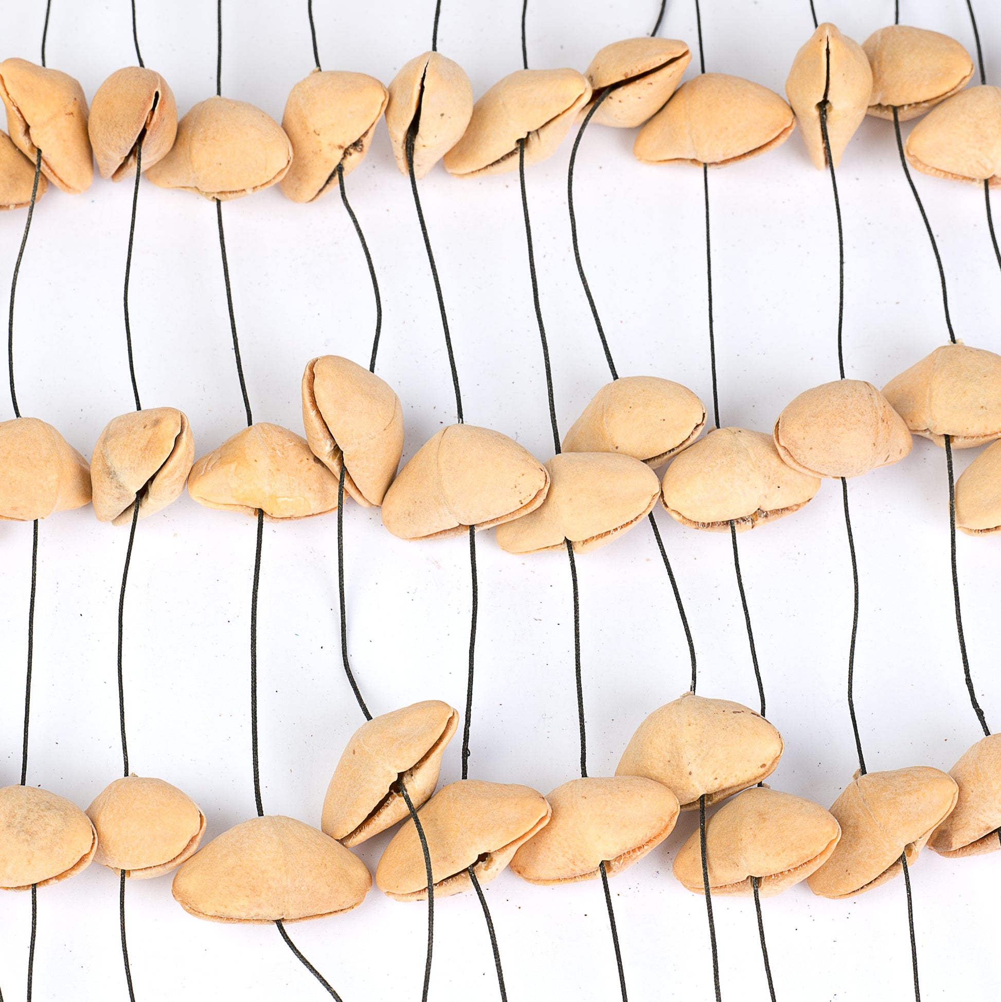 With a matt and slightly porous texture, the Kenari seeds are dense enough to produce a sharp percussive tone. Thanks to this natural density, the Sela Kenari shakers deliver a distinct, crisp, high-mid-frequency click while maintaining an organic, earthy character.